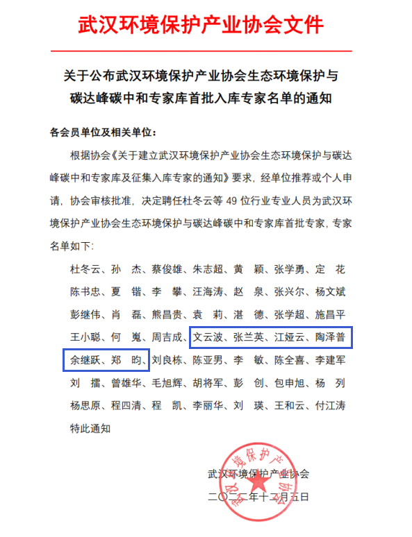 永业行多人入选武汉环境保护产业协会生态环境保护与碳达峰碳中和首批专家库