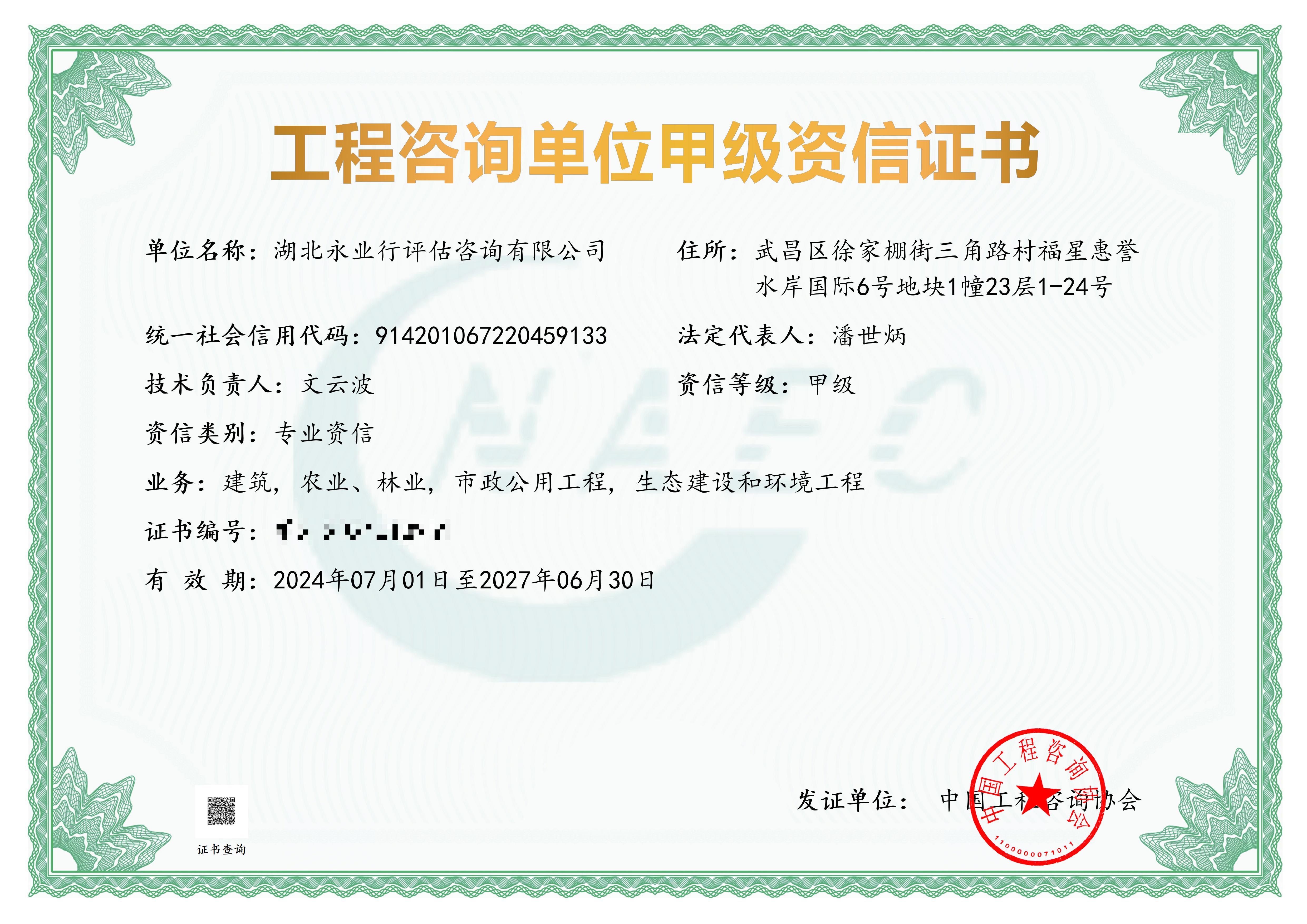 工程咨询单位甲级资信证书(建筑,农业,林业,市政公用工程,生态建设和环境工程)