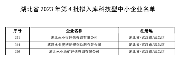 近日,湖北省科技厅公布湖北省2023年度入库科技型中小企业名单,永业行成员机构湖北永业行评估咨询有限公司、武汉永业赛博能规划勘测有限公司、湖北永业地矿评估咨询有限公司位列其中。
