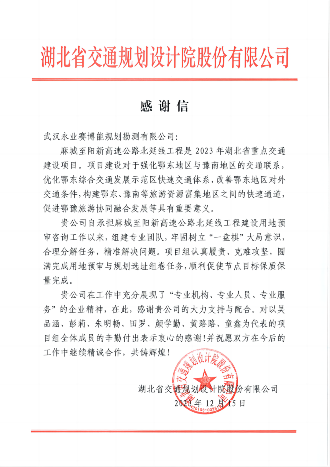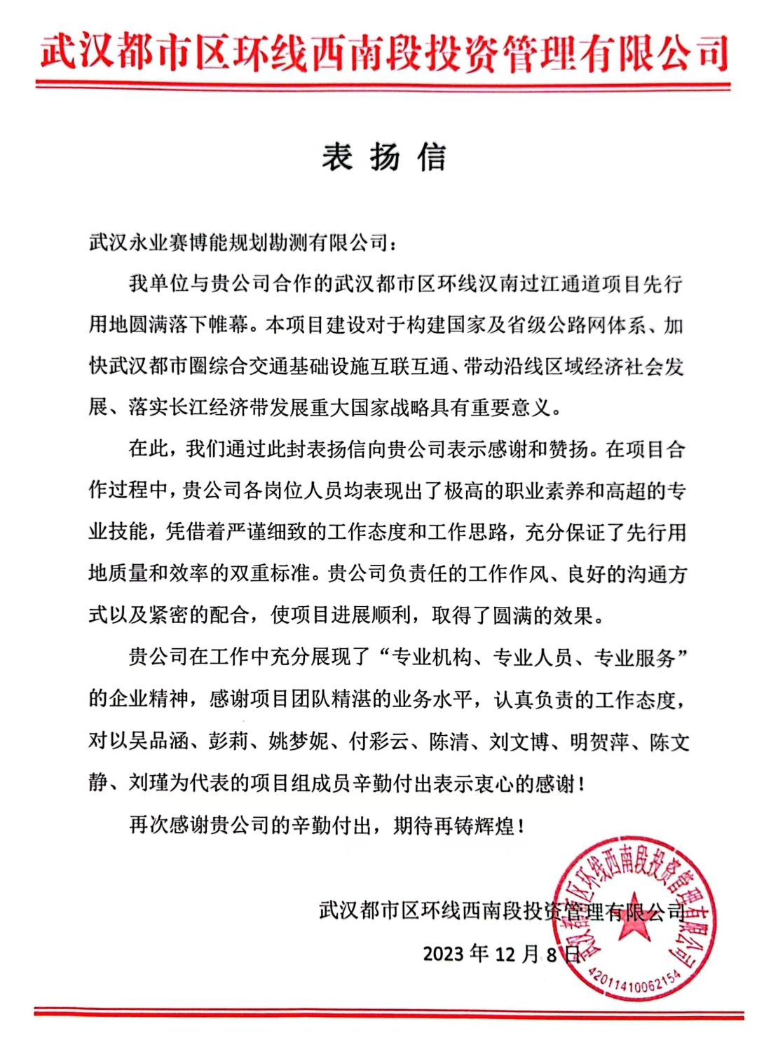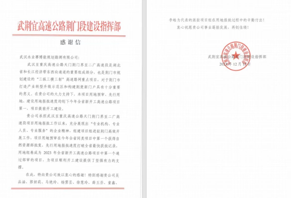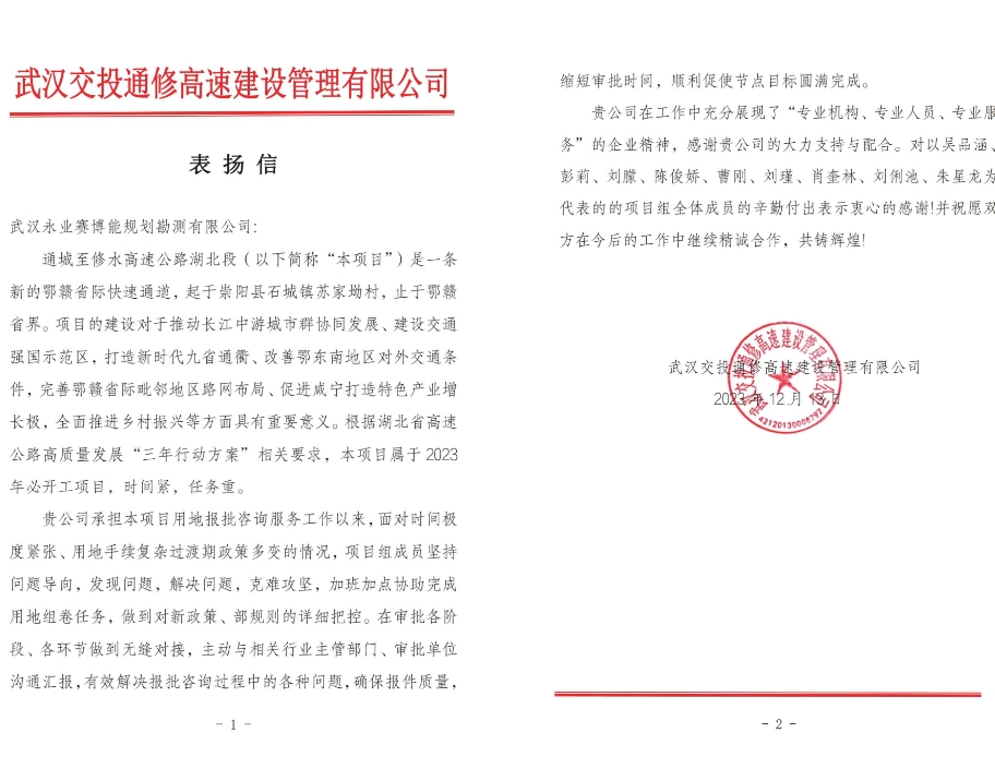 近期,永业行陆续收到来自武汉都市区环线西南段投资管理有限公司、武汉交投通修高速建设管理有限公司、湖北省交通规划永业行股份有限公司、武荆宜高速公路荆门段建设指挥部发来的表扬信和感谢信。信中充分肯定了我司“专业机构、永业行、专业服务”的企业精神,表达持续精诚合作的美好意愿,并给予我司事业蓬勃发展,再创佳绩的良好祝愿。
