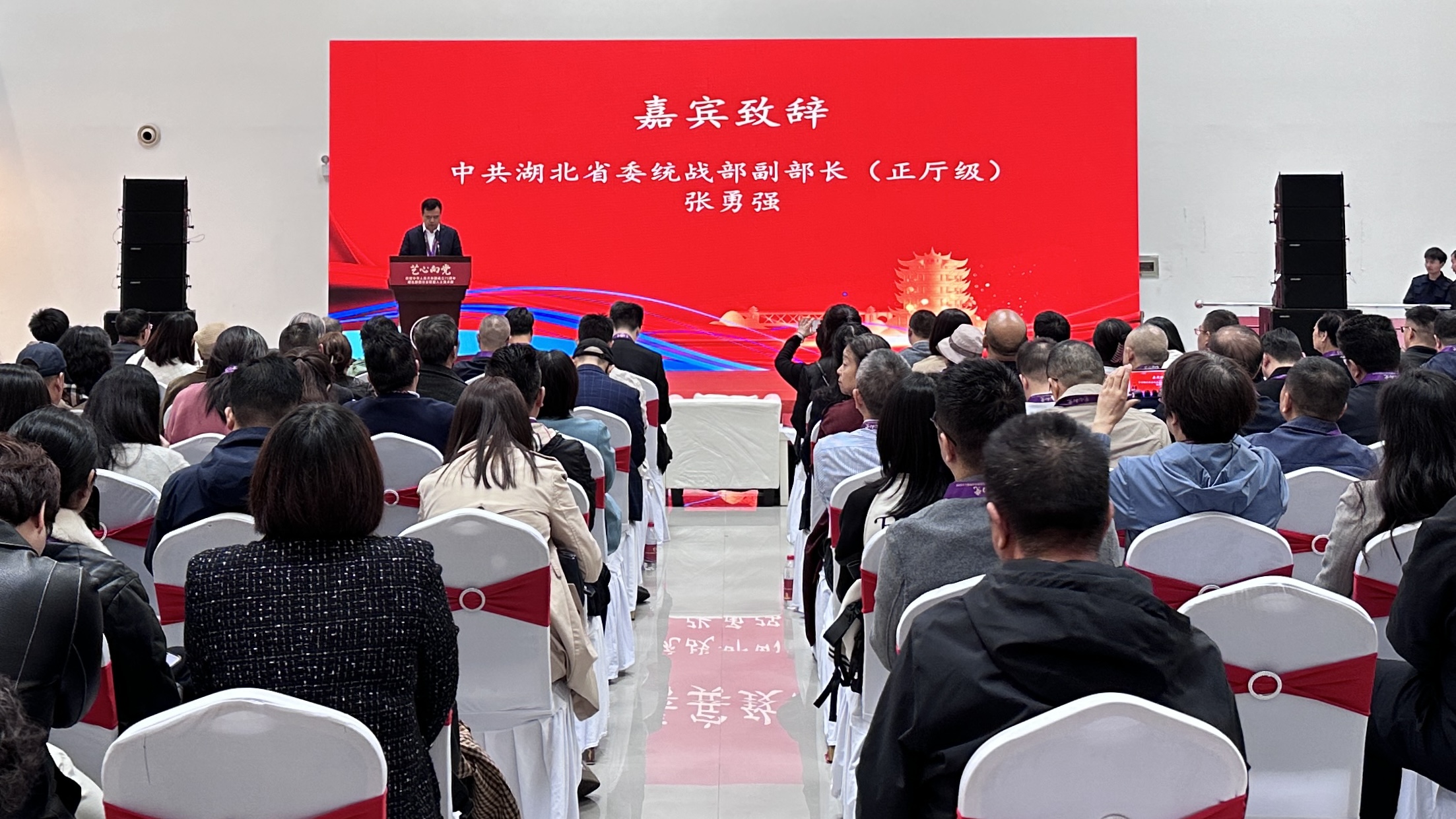 2024年10月21日,湖北省新的社会阶层人士联谊会联合湖北省美术家协会共同举办的“艺心向党”——庆祝中华人民共和国成立75周年湖北新的社会阶层人士美术展开幕式,在中南民族大学美术馆举行。中央统战部六局二处处长李胜出席活动。“艺心向党”全国书画组委会秘书长赵锁平,中共湖北省委统战部副部长(正厅级)张勇强,湖北省文学艺术界联合会党组成员、副主席王永平,中南民族大学党委副书记、副校长宋发军出席活动并讲话。省新联会会长石文先主持活动。省新联会副会长、评估师分会会长、永业行董事长潘世炳,省新联会评估师分会秘书长、永业行常务副总裁吴学锋受邀参加活动。