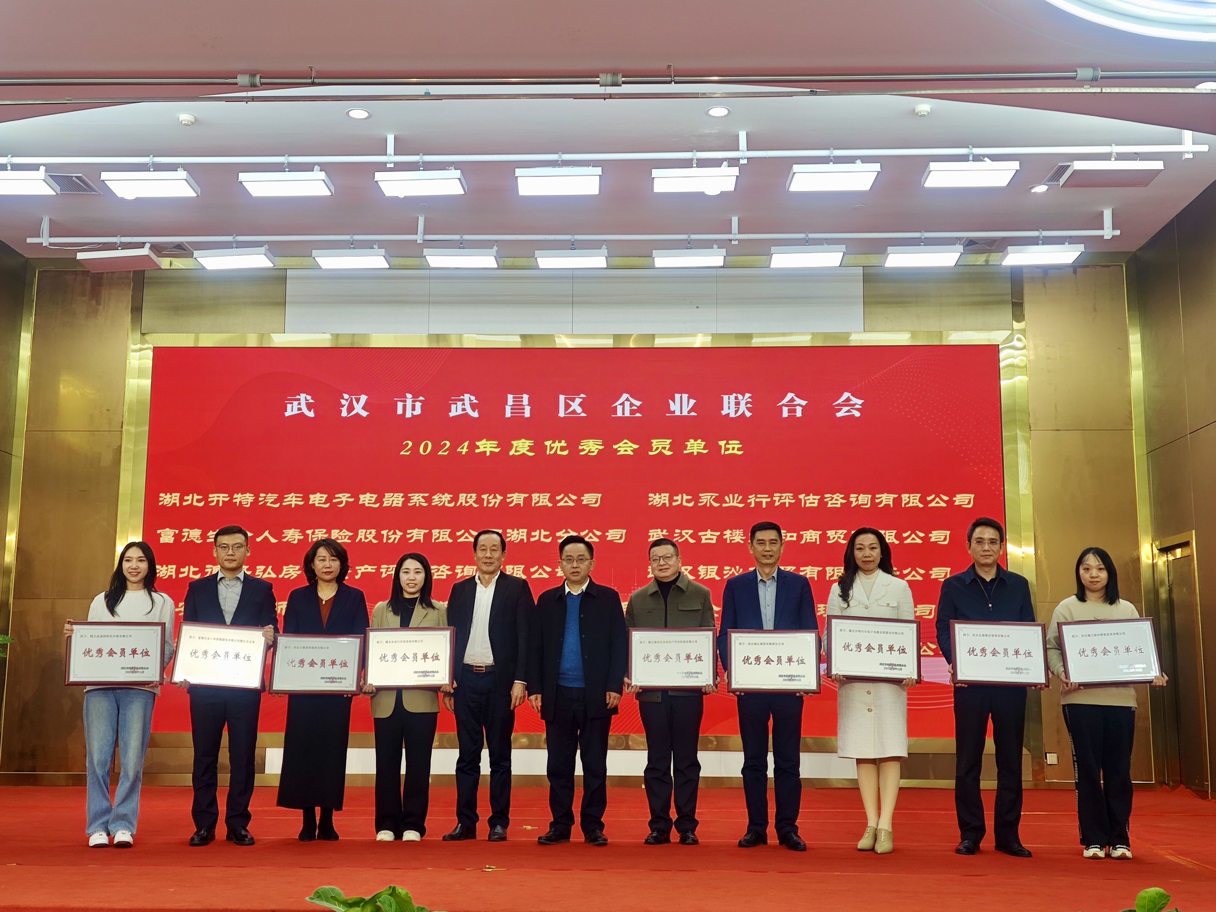 2024年12月30日,武昌区企业联合会(以下简称“武昌企联”)三届三次会员代表大会暨2025年春节团拜会在汉召开。武昌区委副书记、统战部部长李章波,武汉企联会会长高义琼出席会议并讲话,武昌区政协副主席陈烈,武昌区政府副区长、工商联主席钱刚,武昌区政协原主席刘君,硚口区委原常委蔡海雄,硚口区人大常委会原副主任胡亚非,武昌区委统战部副部长陆峰,区委统战部副部长、区工商联党组书记吕志新,武汉企协会长王建东到会指导。会议对武昌企联2024年工作中有突出贡献的会员企业、企业家和优秀协会工作者进行表彰,永业行获评武昌区企业联合会“优秀会员单位”。
