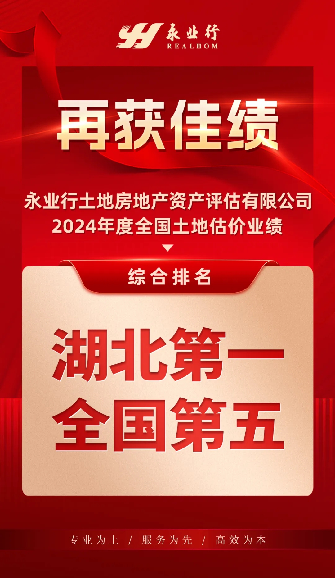 2025年2月26日,中国土地估价师与土地登记代理人协会发布《2024年度全国土地估价业绩综合排名的公告》,在全国4335家备案土地估价机构中,永业行土地房地产资产评估有限公司综合排名湖北第一、全国第五。