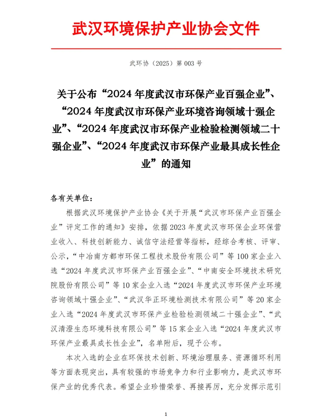 永业行入选2024武汉环保产业百强及环保咨询十强