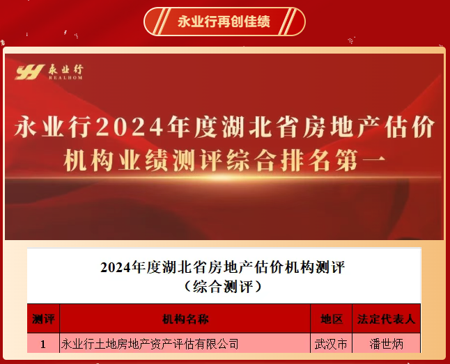 2025年6月4日,湖北省房地产业协会发布“2024年度湖北省房地产估价机构业绩测评结果”,此次测评从总营业收入、房地产估价业务收入、咨询业务收入、注册房地产估价师人数、年纳税总额、评估建筑面积、评估土地面积、评估总价值、法人资格取得年限等9个单项指标进行多维度评估。永业行在本次测评中综合排名第一。