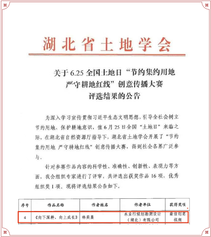 近日,2025年湖北省土地学会6.25全国土地日“节约集约用地,严守耕地红线”创意传播大赛获奖名单揭晓,永业行参赛作品《向下深耕,向上成长》获评“最佳创意视频”。